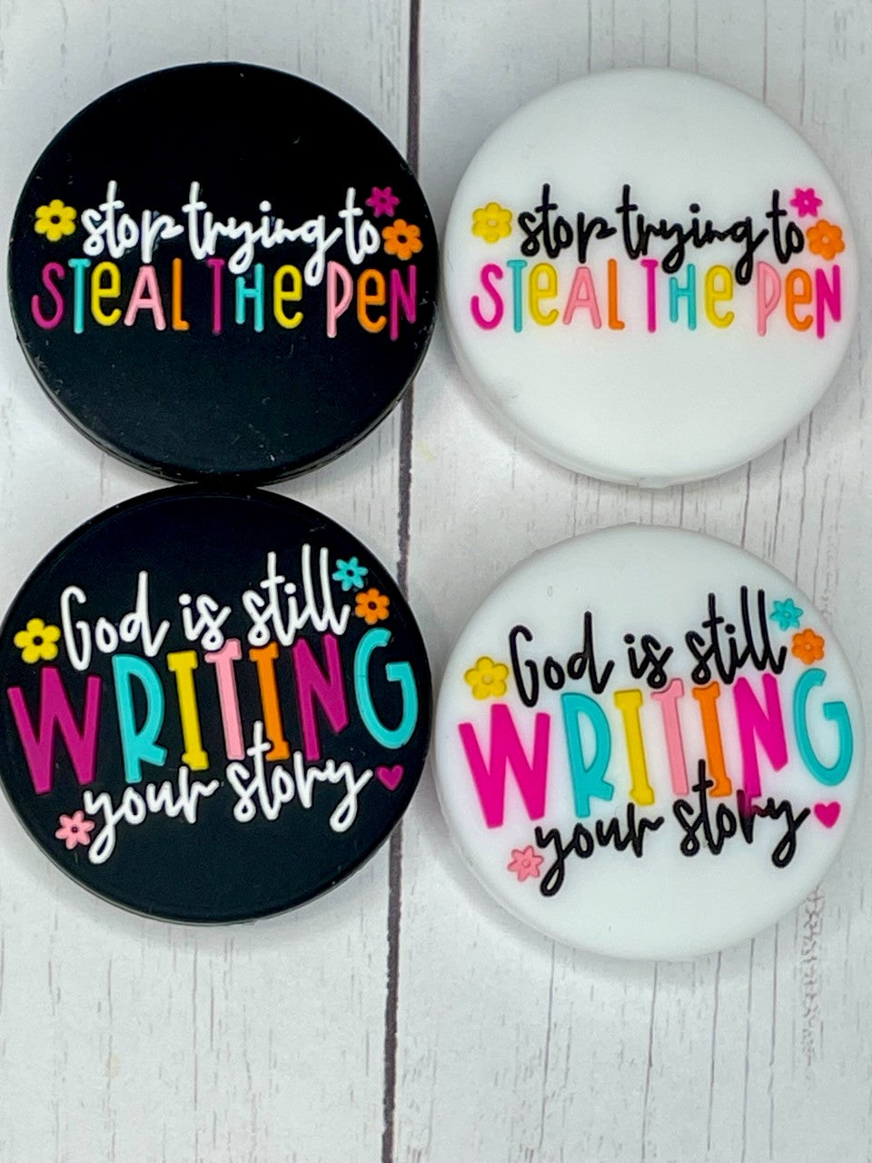 Stay in the present and enjoy the creative process with this focal bead. The quirky phrase serves as a reminder to let go of control and trust the journey. Add it to your DIY projects for a touch of humor and inspiration. Let God handle the storytelling! (No more pen thieving!)